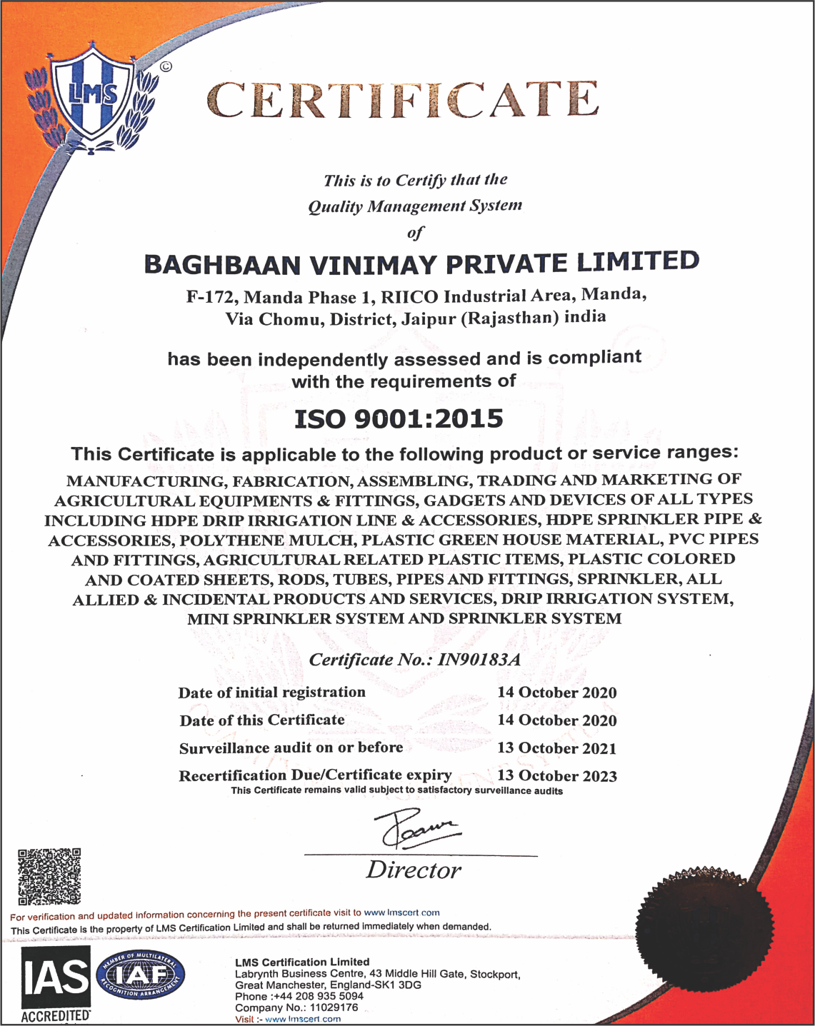 Baagwaan Irrigation Pvt. Ltd. is committed to providing products and services that meet or exceed all customer requirements and applicable standards and specifications. Each employee is committed to this goal. The Corporate Quality Policy is to continually improve installation performance by supplying —on time—goods, services and information of a quality standard that shall consistently meet or exceed the requirements of our customers. We will ensure a high level of customer satisfaction to maintain long term commitments, productive customer relationships, and to provide a positive work environment. All personnel of the firm are responsible for the attainment and maintenance of this quality standard. Baagwaan Irrigation Pvt. Ltd. is ISO 9001-2015 certified and is regularly audited by outside parties for performance to this standard.
